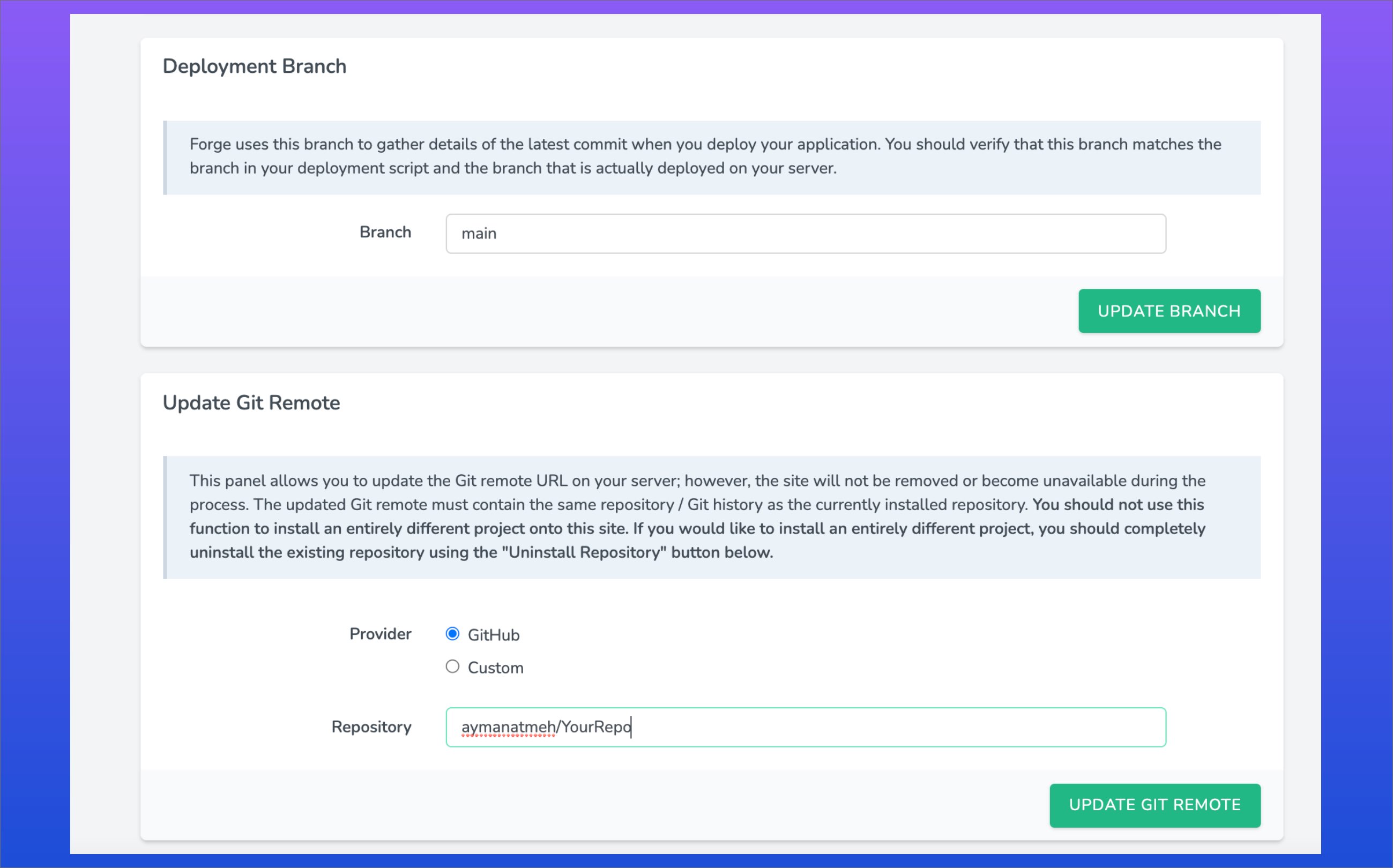 Make sure when you enter your Repository to provide the repository name. For GitHub, GitLab, and Bitbucket providers, you should provide the name in user/repository format