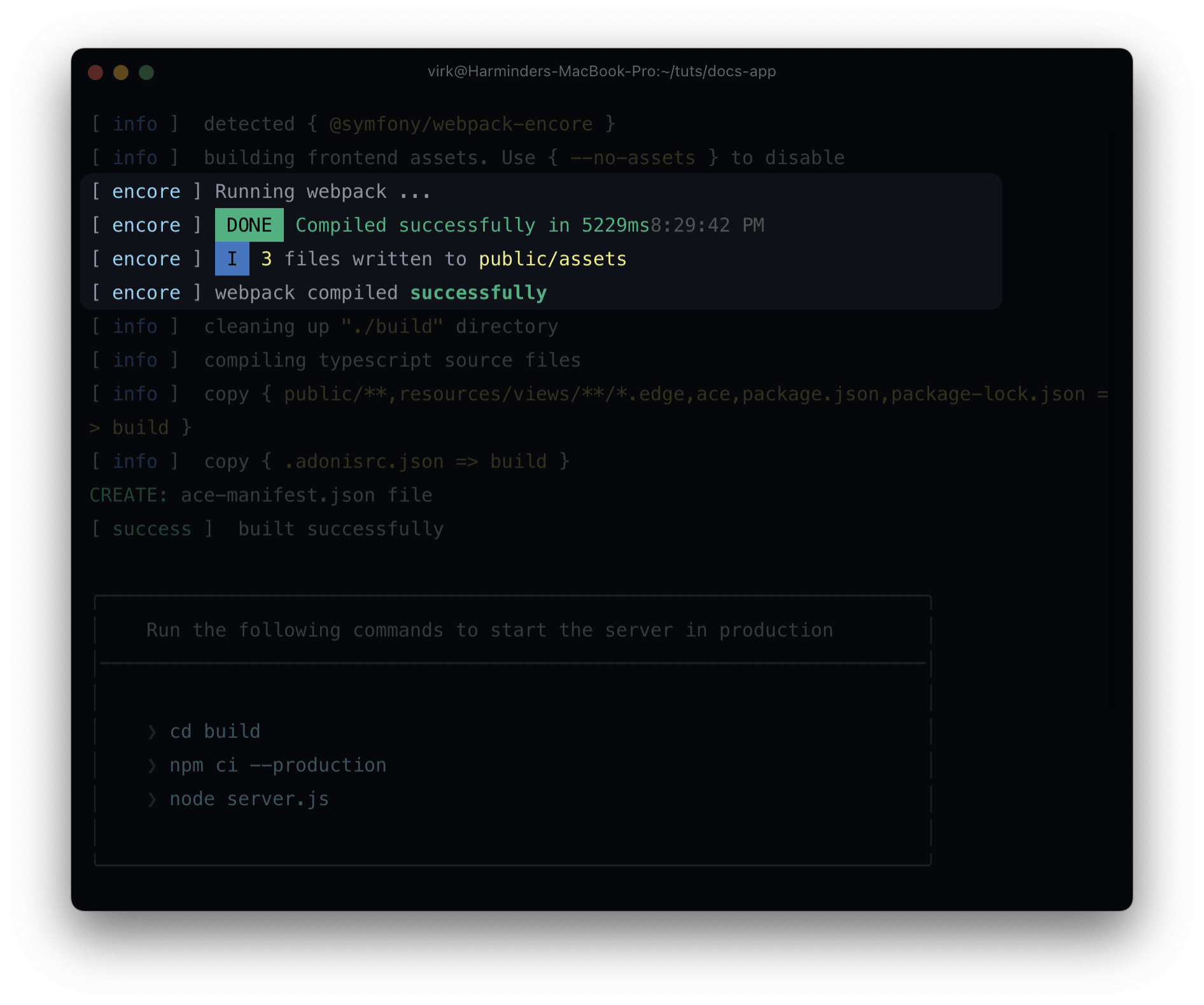 Similarly, the node ace build --production command will also run the encore production command to bundle the frontend assets alongside your AdonisJS build.